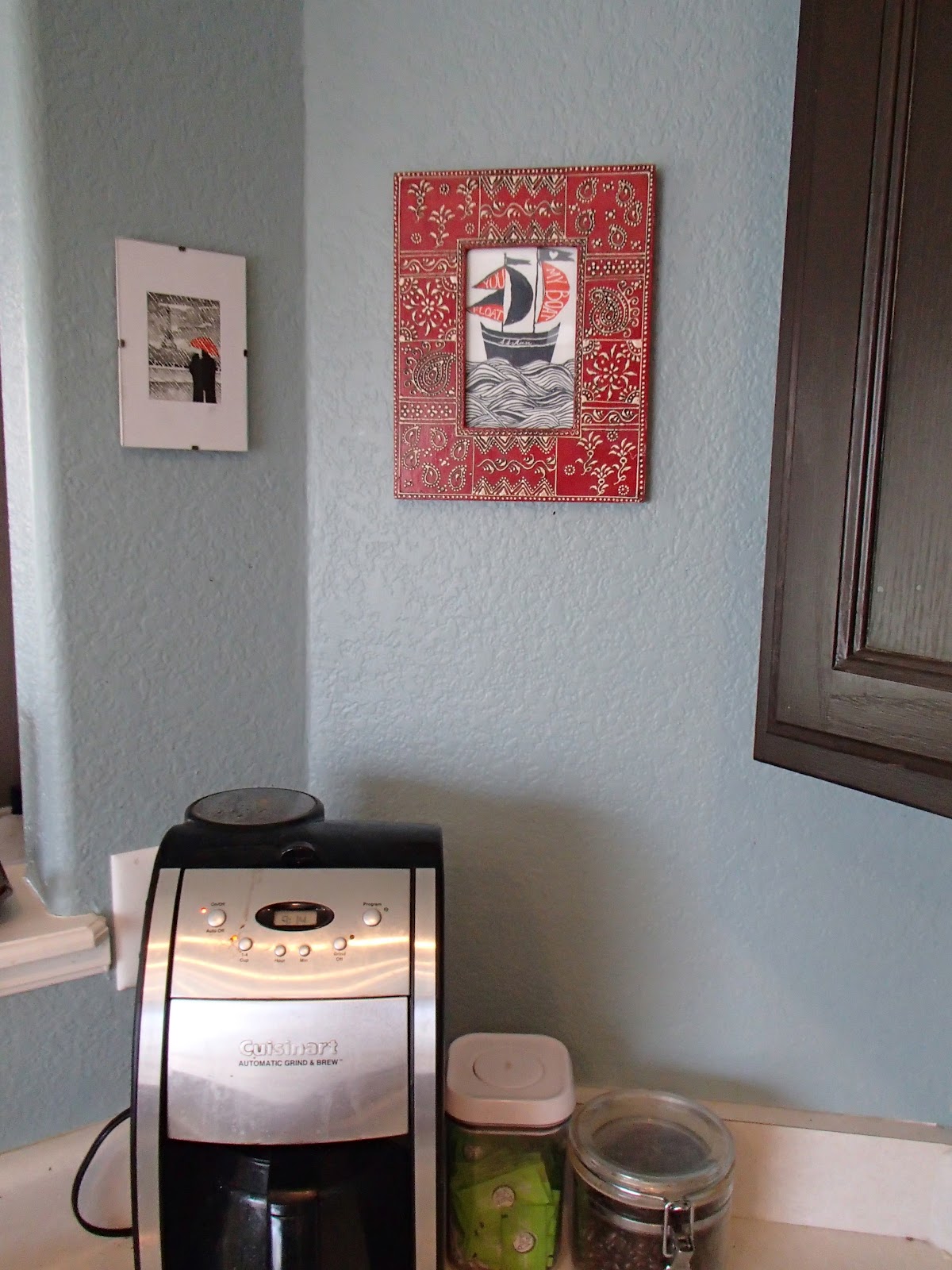This came to be in a really random way. As you saw above, the umbrella picture was always there (and played a big role in motivating me to go red with the knife block). Then, while hunting through a basket of stuff in our yet-to-be-unpacked "office," I found that boat print, which is actually a card Phil got me for our anniversary last year. I thought it was an awesome card and noticed immediately that the red flags matched the red umbrella almost perfectly. Another lightbulb went off in my head (my head was getting pretty bright by now), and I knew it needed to join the umbrella picture in the kitchen. Initially I stuck it on the wall unframed, but quickly realized that looked way too random and unfinished. Then yet another lightbulb went off (you might want to grab your sunglasses at this point) and I remembered we had a gorgeous red frame sitting unused in the basement. Bada bing bada boom, we now have even more awesomely funky red pops in the kitchen that make the knife block seem totally not random and it all just makes sense now. And I love it! Oh and in addition to the sentiment of the boat card Phil got me, that umbrella picture is very sentimental as well. Phil bought me that print when he visited Paris with his family a looong time ago, back before we were even dating (back during the time when we were really good friends, and knew we were head over heels in love with each other, but kept fervently denying it to ourselves. And each other. And our friends. And our significant others at the time. Yikes. Let's not go there). So not only does the red = super funky and awesome color pop, but that little corner of the kitchen is now also full of sentimentality and warm fuzzy feelings of love.